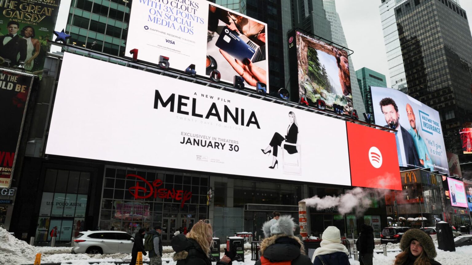 A movie poster for the documentary “Melania” featuring U.S. first lady Melania Trump is displayed in New York, U.S., Jan. 26, 2026.