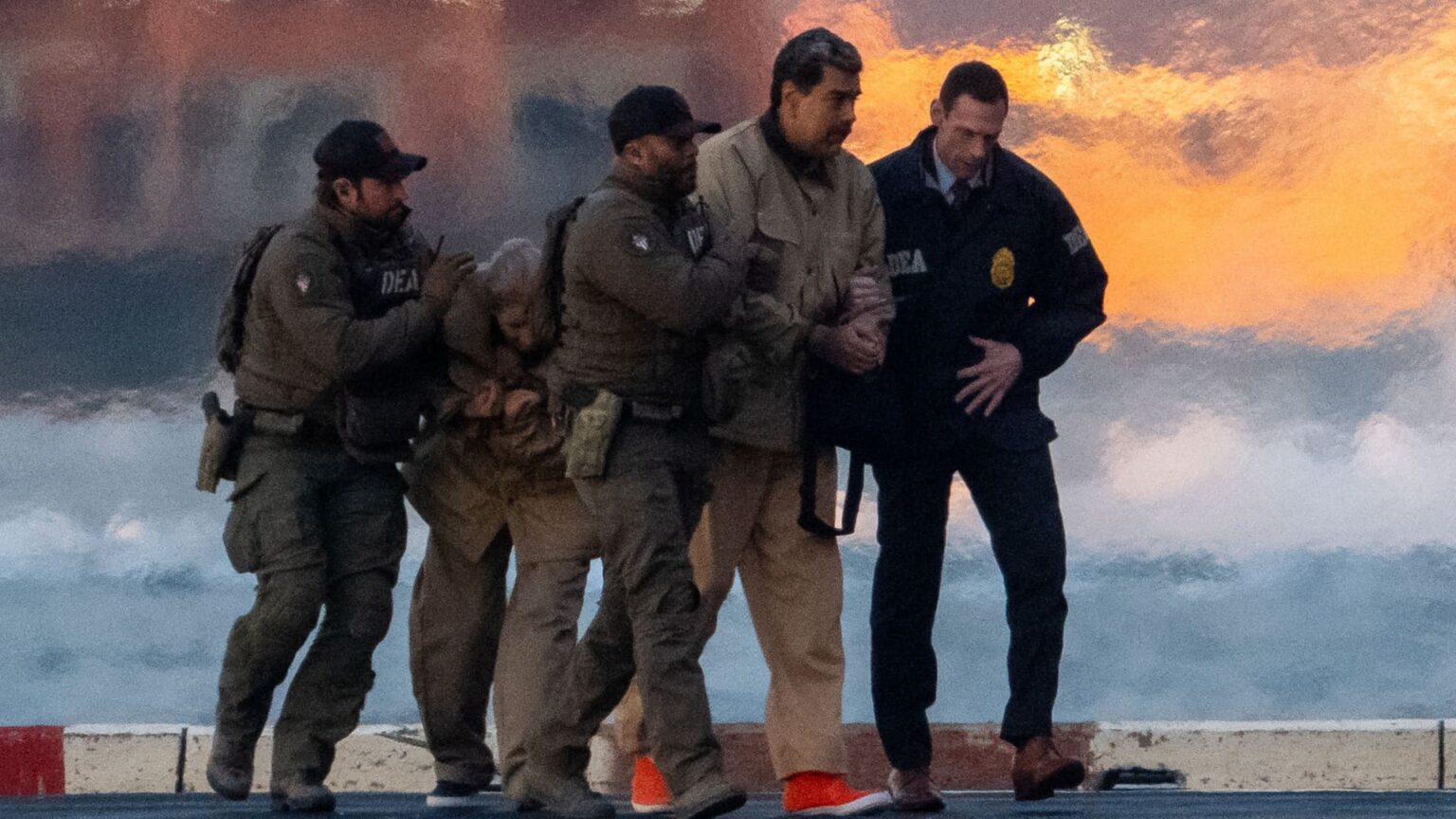 Captured Venezuelan President Nicolas Maduro and his wife Cilia Flores are escorted, as they heads towards the Daniel Patrick Moynihan United States Courthouse in Manhattan for an initial appearance to face U.S. federal charges including narco-terrorism, conspiracy, drug trafficking, money laundering and others, at Downtown Manhattan Heliport, in New York City, U.S., Jan. 5, 2026.