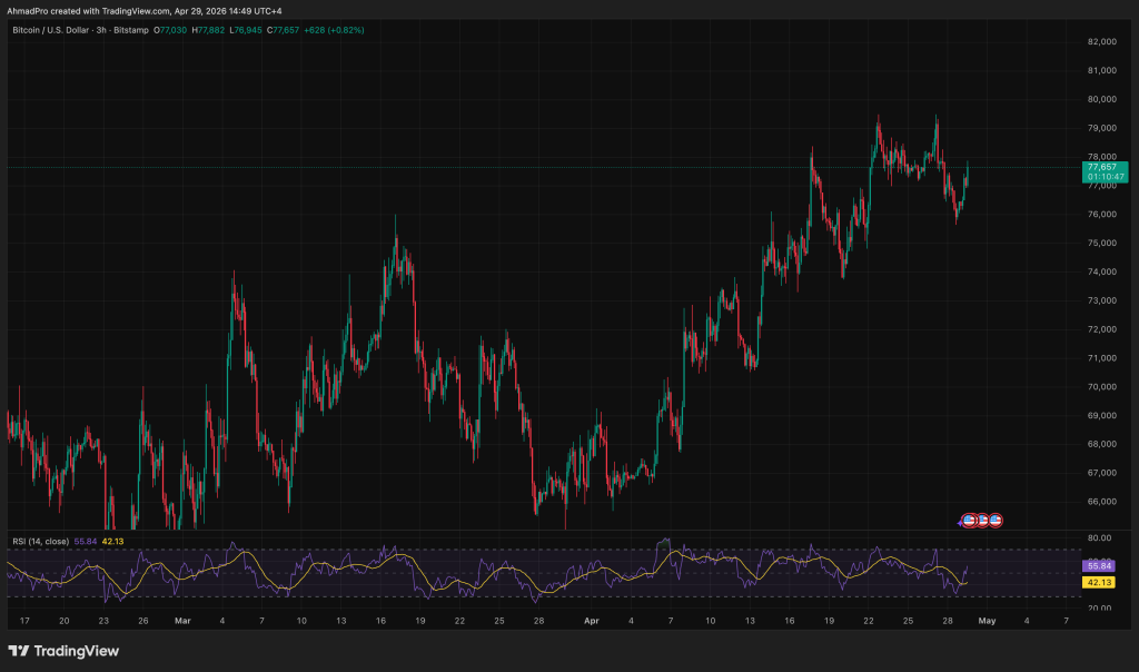 Bitcoin is holding $77K. As long as that level holds, the structure stays neutral and opens a move toward $78.2K–$78.7K. If it reclaims that zone with volume, $80K comes back into play.