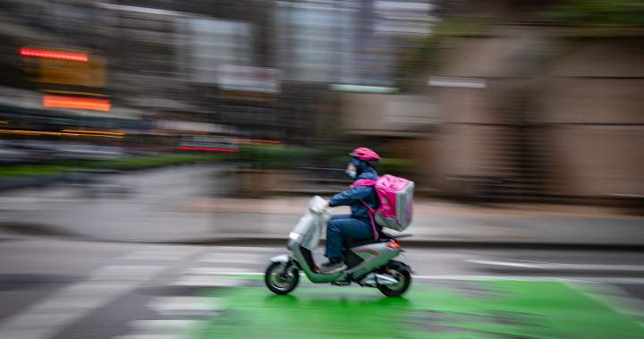 A food delivery worker rides an electric bike in downtown Vancouver.