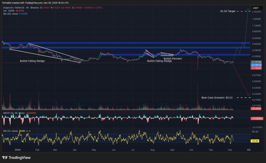 The token formed several bullish chart setups in late summer and early autumn, but momentum has since cooled. In Alibaba’s more negative scenario, DOGE could sink to $0.02, a drop of about 86% from its current price of $0.1387.