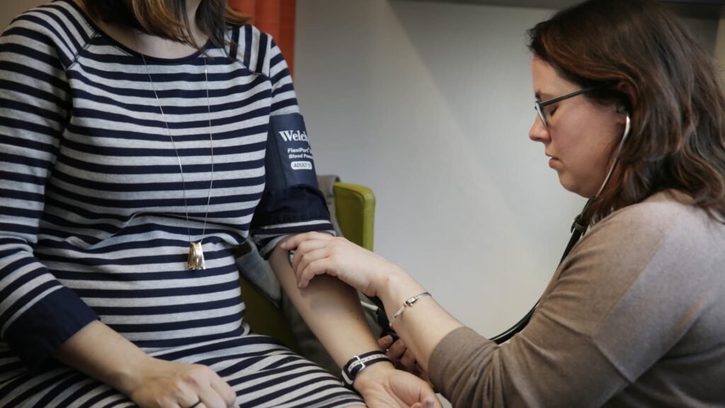 Dr. Stephanie Long (right), MD, of One Medical Group takes the blood pressure of Danielle Greene (left), who is 20 weeks pregnant, during a prenatal appointment on Thursday, February 4, 2016 in San Francisco, Calif.