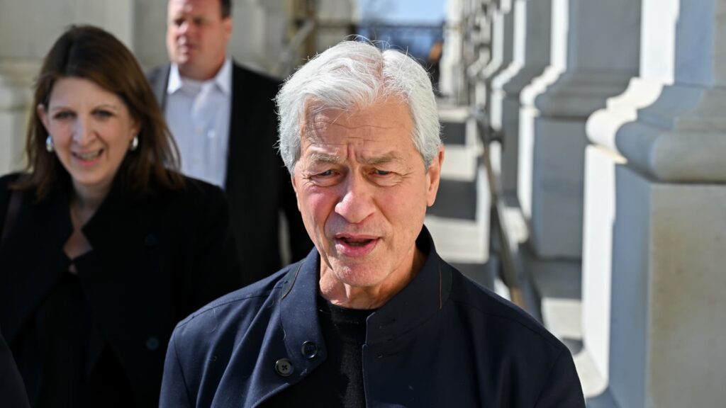 Jamie Dimon, chief executive officer of JPMorgan Chase & Co., right, departs the US Capitol in Washington, DC, US, on Wednesday, Feb. 25, 2026.