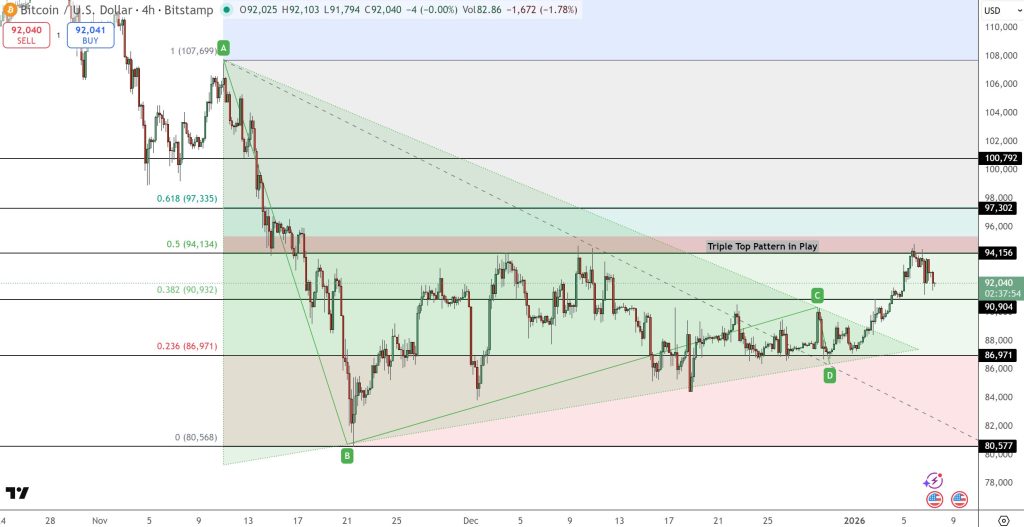 On the 4-hour chart, Bitcoin price prediction seems neutral as BTC is consolidating near $92,000 inside a descending channel drawn from the $107,700 peak. Price continues to respect the 38.2% Fibonacci retracement at $90,900, while repeated rejection near $94,100 has formed a visible triple-top resistance zone.
