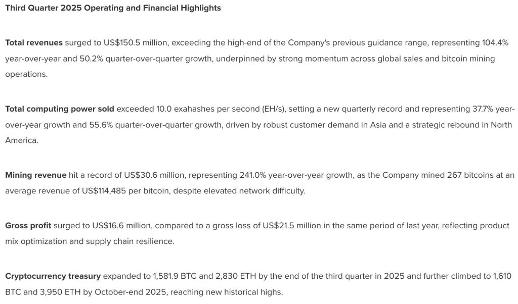 The results were fueled by a sharp rise in mining machine sales and record self-mining output. Canaan sold more than 10 exahashes per second of computing power in the quarter, a new company record, and expanded its self-mining capacity to 9.3 EH/s.