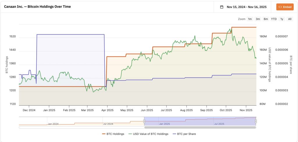 Canaan also reported record-high crypto holdings, ending September with 1,582 BTC and 2,830 ETH. By the end of October, its stash grew to 1,610 BTC and 3,950 ETH, valued at more than $161 million at recent market prices.
