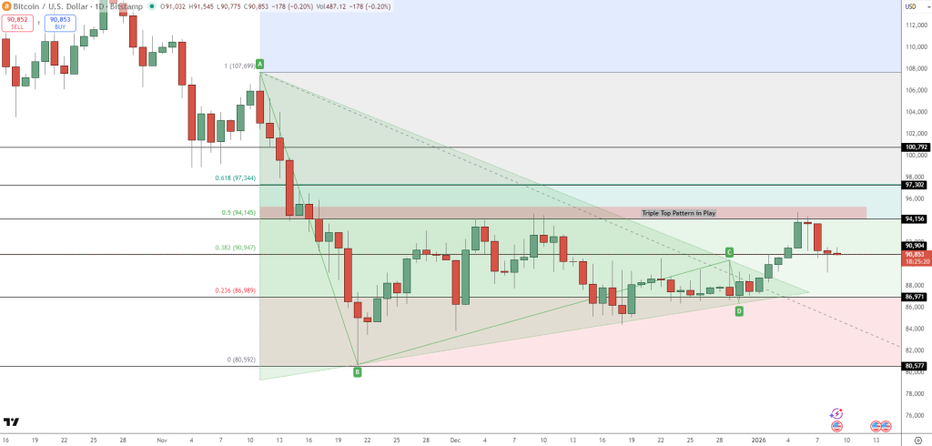 The critical resistance zone sits between $94K and $97.3K, where prior supply, the triangle’s upper boundary, and the 0.618 Fibonacci retracement converge. A daily close above this band would likely trigger a volatility expansion.
