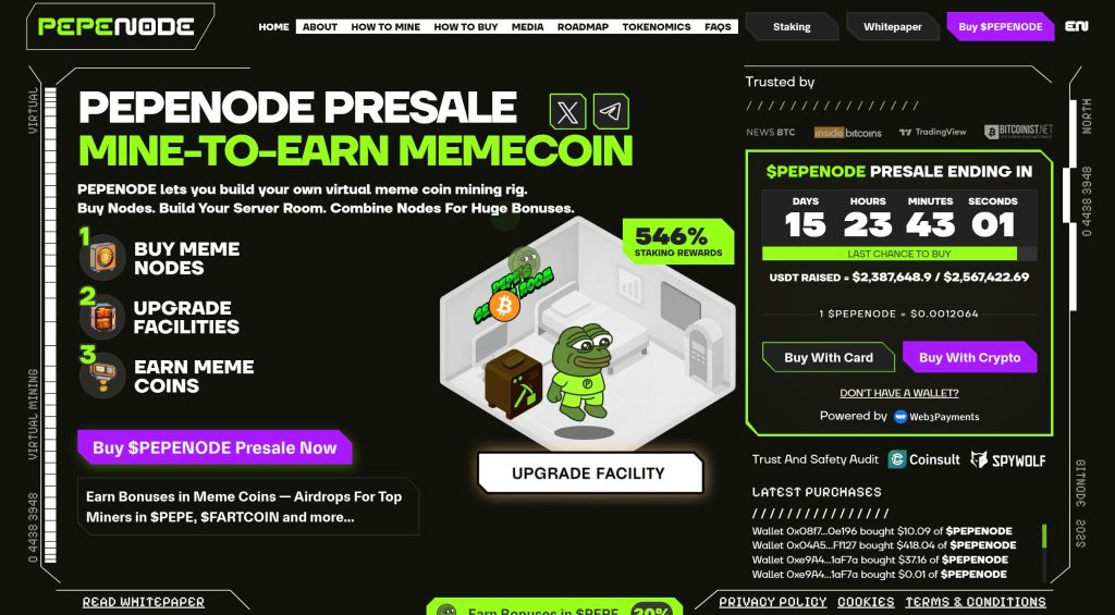 What makes PEPENODE stand out is its mine-to-earn virtual ecosystem. Instead of passive holding, users can build digital server rooms using Miner Nodes and facilities, earning simulated rewards through a visual dashboard. The concept brings gamification and competition into the meme coin space, giving holders something to do before launch.