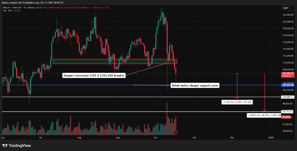 Break below $103,500 triggers deeper correction toward $100K with potential extension to $95K–$97.5K.