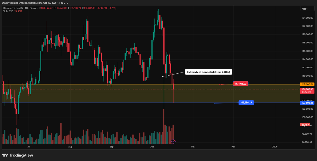 Range $103,500–$108,000 allows institutional accumulation before directional break.