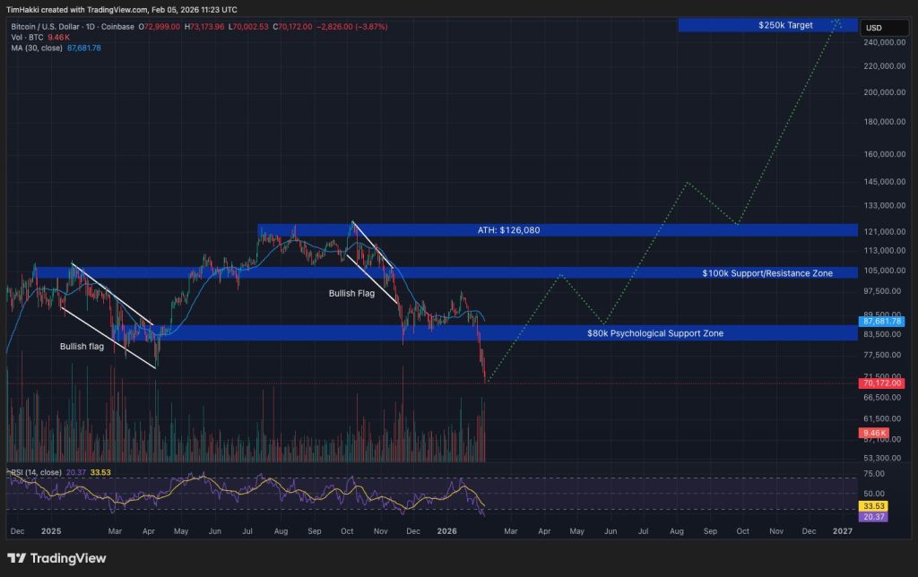 Bitcoin currently capitalizes $1.4 trillion of the $2.46 trillion total cryptocurrency market. Since hitting its ATH, BTC has fallen by around 44.5% and now trades near $70,400 following two sharp market downturns driven by global geopolitical uncertainty over potential US military action in Iran and Greenland.