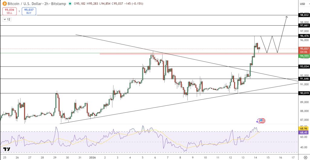 From a technical standpoint, Bitcoin price prediction seems bullish as BTC’s structure has turned decisively constructive. On the 2-hour chart, BTC has broken cleanly above a long-developing symmetrical triangle that constrained price action through early January. The breakout followed a clear sequence of higher lows pressing against descending resistance, a classic setup for directional expansion.