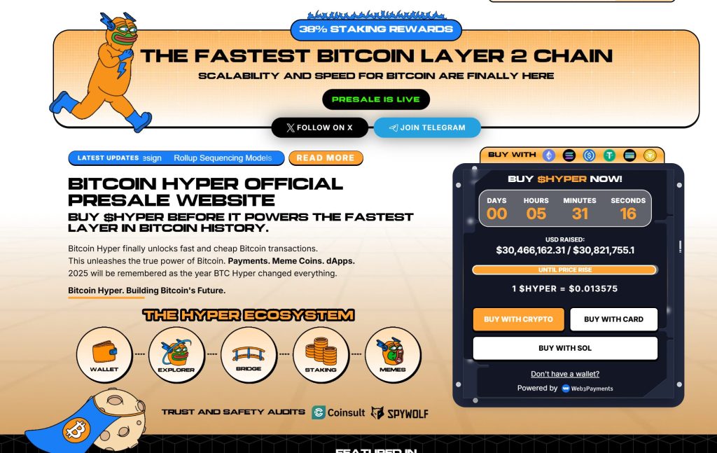 Bitcoin Hyper ($HYPER) is bringing a new phase to the Bitcoin ecosystem. While BTC remains the gold standard for security, Bitcoin Hyper adds what it always lacked: Solana-level speed. The result: lightning-fast, low-cost smart contracts, decentralized apps, and even meme coin creation, all secured by Bitcoin.