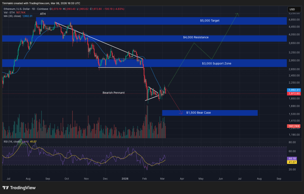 Technically, ETH is attempting to invalidating a bearish pennant formation that emerged throughout February. For long-term investors, current price levels could represent an attractive accumulation opportunity.
