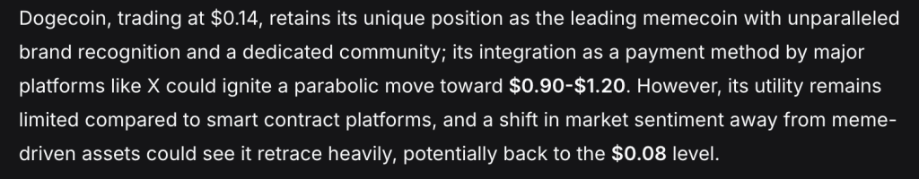 Despite that, DeepSeek still sees a possible recovery in the sector, noting that Dogecoin integration as a payment method on major platforms like X could ignite a parabolic move.