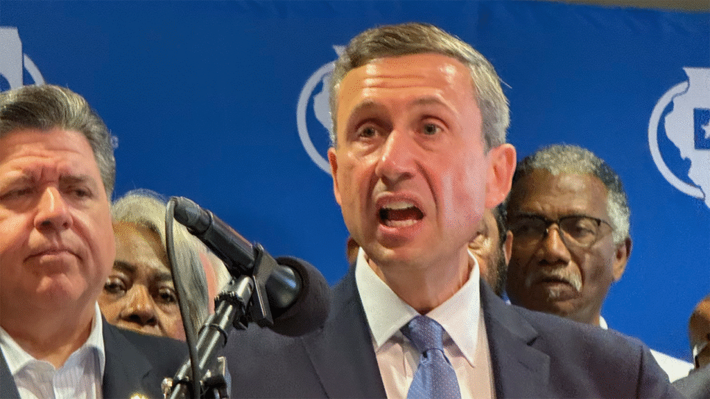 Democratic National Committee chair Ken Martin, standing alongside Illinois Gov. JB Pritzker, at an event in Chicago on Aug. 5, 2025. (DNC)