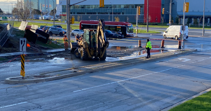 Around 4:15 a.m. on Monday, Toronto fire said they received reports of a stream of water 10-feet high near the area of Neilson Drive and Dundas Street West.