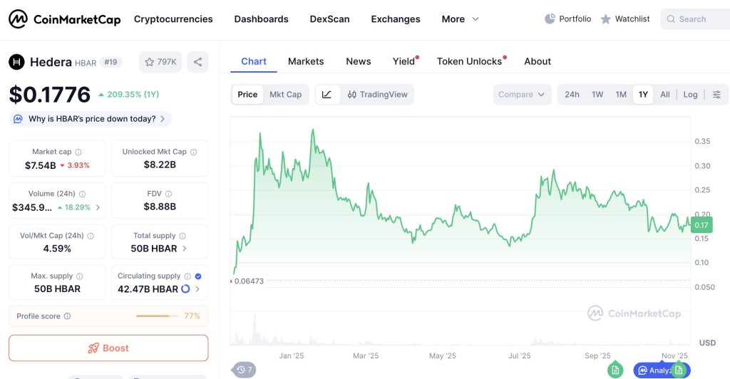 HBAR is trading at $0.1776, up 209% year-on-year, with a market cap of $7.54B. Despite a recent 3.9% daily dip, the token remains one of 2025’s top Layer-1 performers. Trading volume over the past 24 hours rose 18.29% to $345.9M.