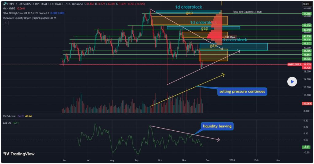 Chart readings show that HYPE remains below major resistance zones, with supply clusters between $36 and $42 acting as a ceiling for recovery attempts.