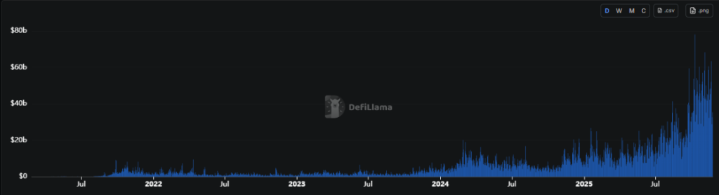 According to data from DefiLlama, daily perp volume across decentralized exchanges fluctuates between $28 billion and $60 billion.