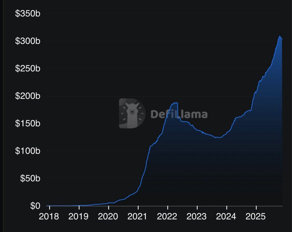 The stablecoin market now stands at roughly $309 billion, according to DefiLlama, up more than 6,000% since late 2019.