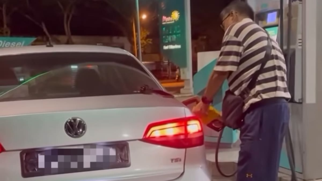 It shows a man pumping RON95 fuel – which is only subsidised for Malaysians with locally-registered vehicles – into a car with a partially obscured license plate.
