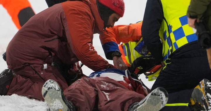 Medical personnel stretcher Canada’s Mark McMorris off after crashing during a snowboard big air training session at the 2026 Winter Olympics, in Livigno, Italy, Wednesday, Feb. 4, 2026.