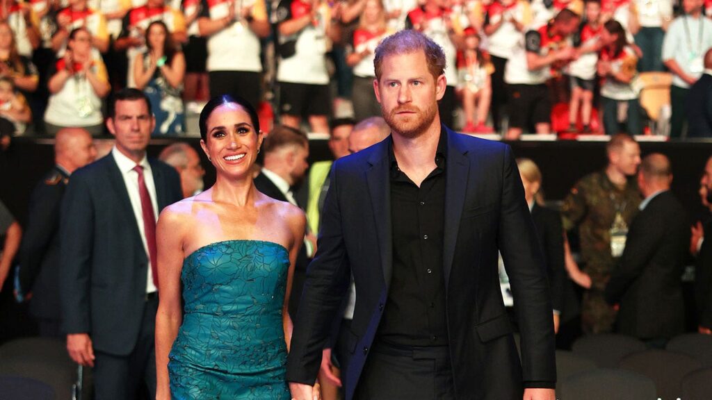 Prince Harry, Duke of Sussex, and Meghan, Duchess of Sussex, are seen attending the closing ceremony of the Invictus Games Düsseldorf 2023 at Merkur Spiel-Arena on Sept. 16, 2023, in Duesseldorf, Germany. On Oct. 9, 2025, the couple will be receiving the “Humanitarians of the Year” award. (Chris Jackson/Getty Images for the Invictus Games Foundation)