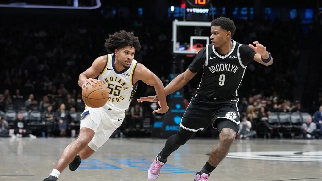 Indiana Pacers center Jay Huff dribbles the ball against Brooklyn Nets forward Trevon Scott during the second half at Barclays Center in Brooklyn on April 9, 2026. (Gregory Fisher/Imagn Images)
