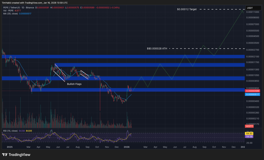 PEPE is currently trading near $0.0000059, placing it roughly 79% below its December 2024 ATH of $0.00002803.