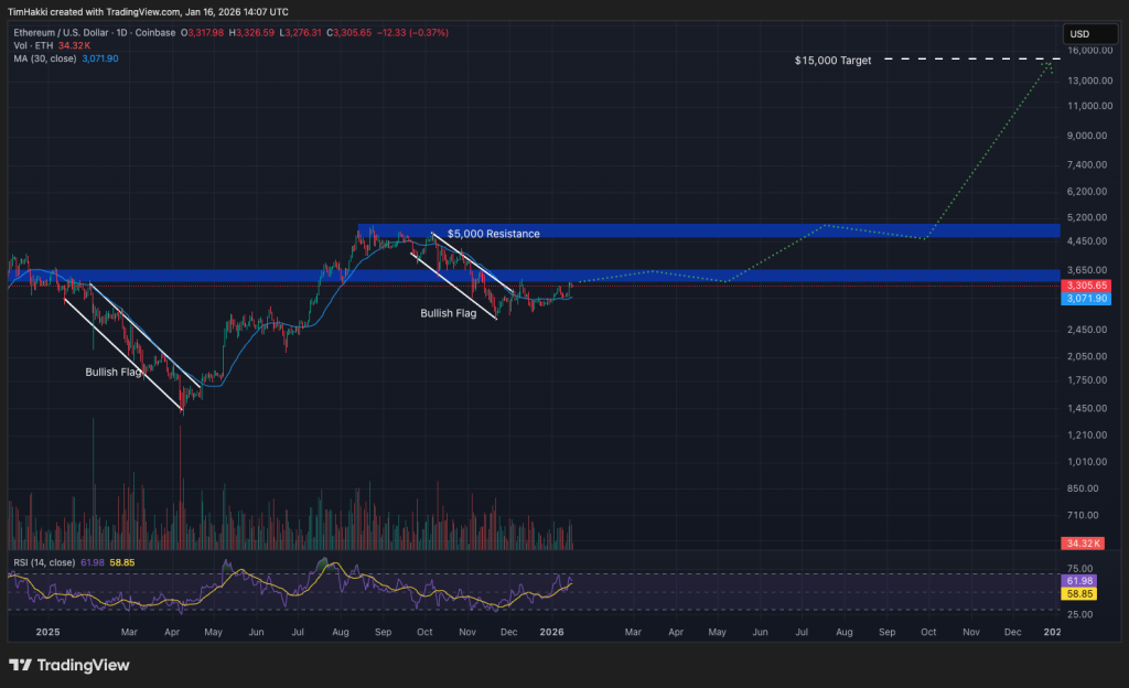 ETH is currently trading around $3,308, with strong resistance expected near $5,000. It set its all-time high of $4,946.05 back in August.