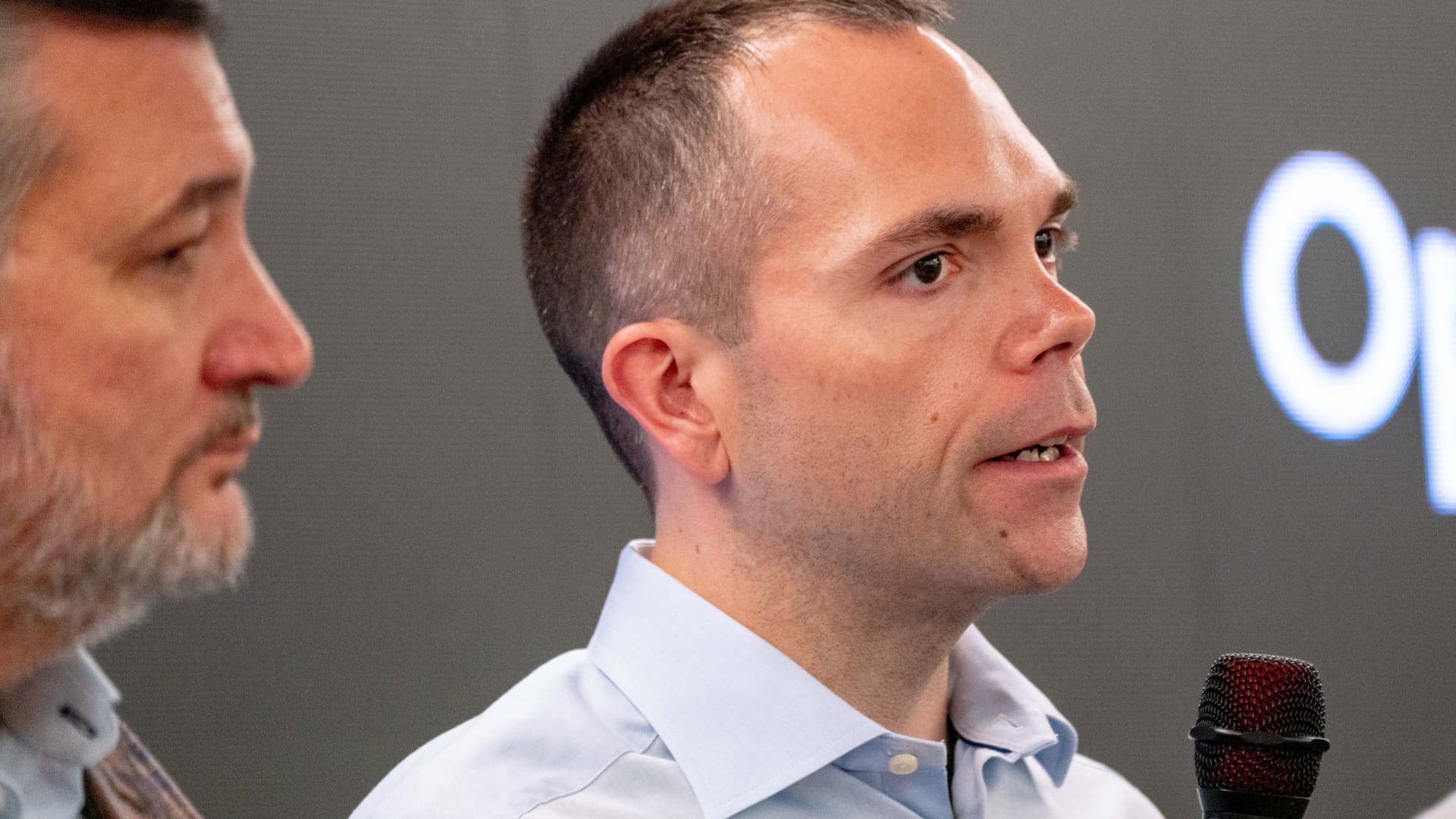 Oracle CEO Clay Magouyrk, center, speaks on a media tour of the Stargate data center in Abilene, Texas, on Sept. 23, 2025. Stargate is a collaboration of OpenAI, Oracle and SoftBank, with promotional support from President Donald Trump, to build data centers and other infrastructure for artificial intelligence throughout the US.