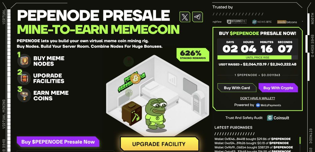 Head to the PepeNode site to buy using ETH, BNB, or USDT (ERC-20 or BEP-20), or even a credit card. The project has already raised over 2 million dollars in a short time. If you missed early Pepe, this could be your second chance.
