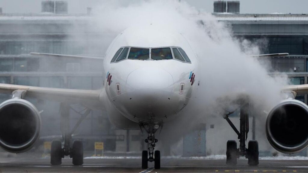 At the start of the day, no aircraft were able to take off after freezing rain had encased aeroplanes in ice, meaning it was taking up to an hour to de-ice the aircraft.