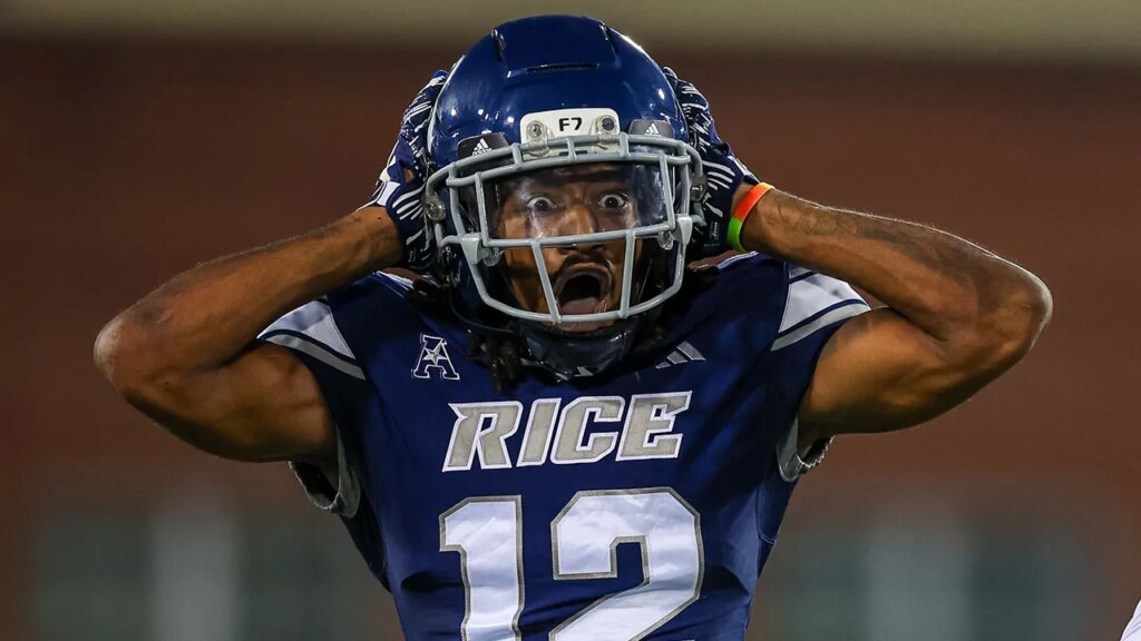 Rice’s Khary Crump reacts to a call during the first half of a football game at Jerry Richardson Stadium on Sept. 18, 2025 in Charlotte, North Carolina.  (David Jensen/Getty Images)