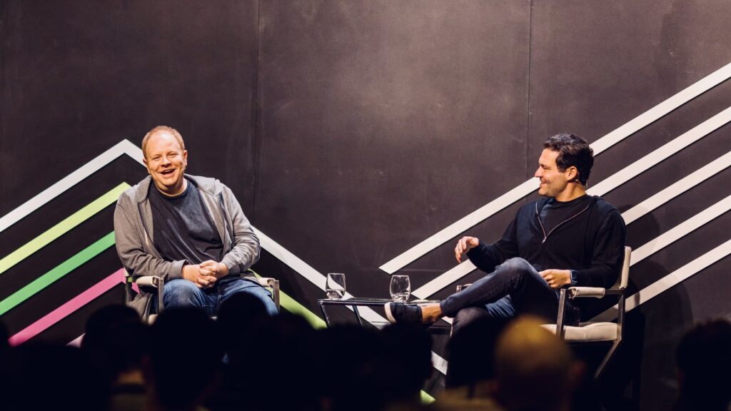 From left, Parker Conrad, co-founder and CEO of Rippling, and Kleiner Perkins investor Ilya Fushman speak at the venture firm’s Fellows Founders Summit in San Francisco in September 2022.