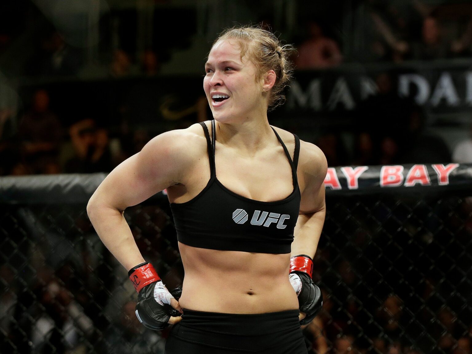 Rousey won the UFC’s first-ever women’s bout in 2013 to claim the bantamweight title belt, and she still holds the promotion’s record with six title defences.