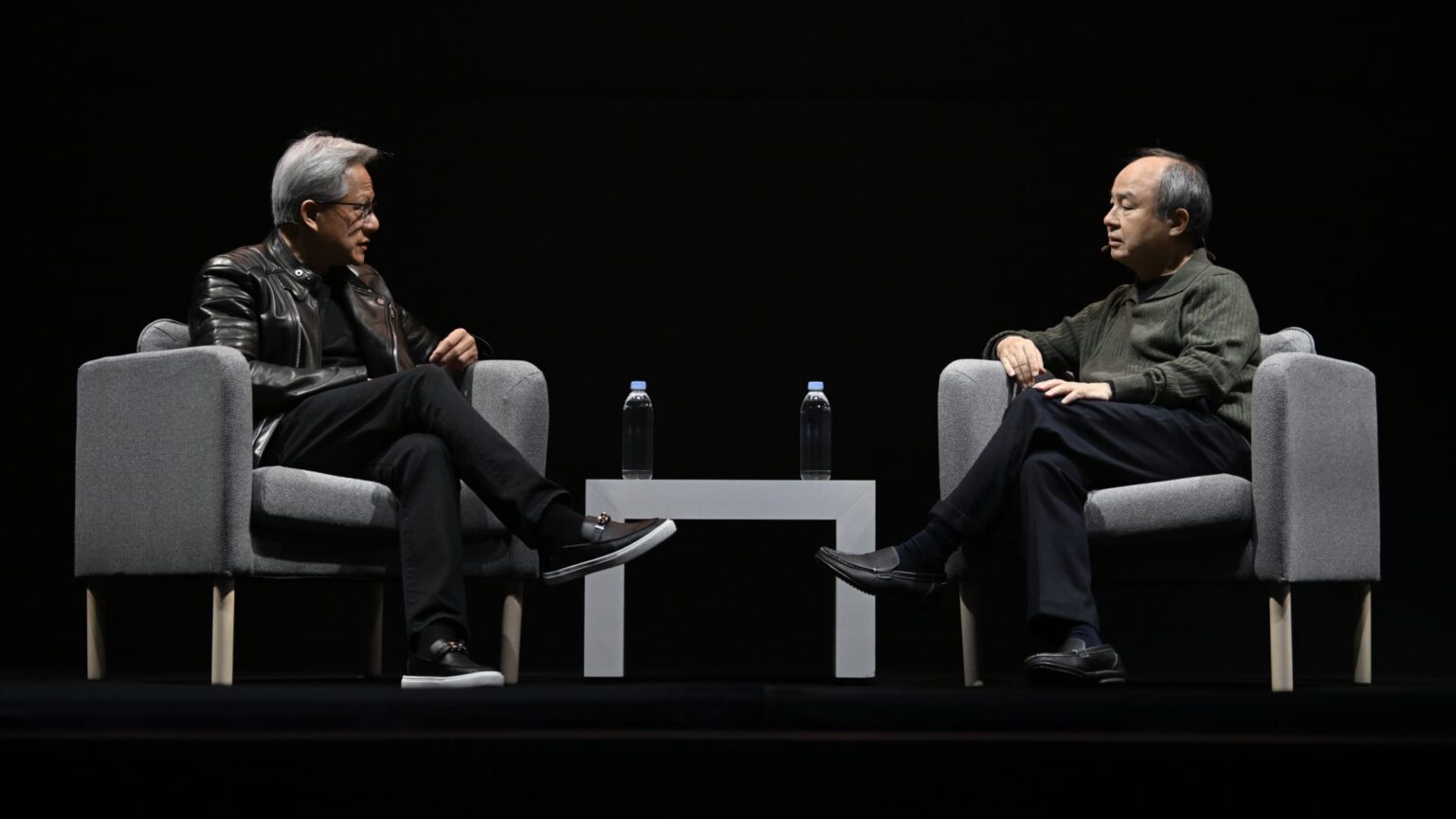 Jensen Huang, co-founder and chief executive officer of Nvidia Corp., left, and Masayoshi Son, chairman and chief executive officer of SoftBank Group Corp., during a fireside chat at the Nvidia AI Summit Japan in Tokyo, Japan, on Wednesday, Nov. 13, 2024.
