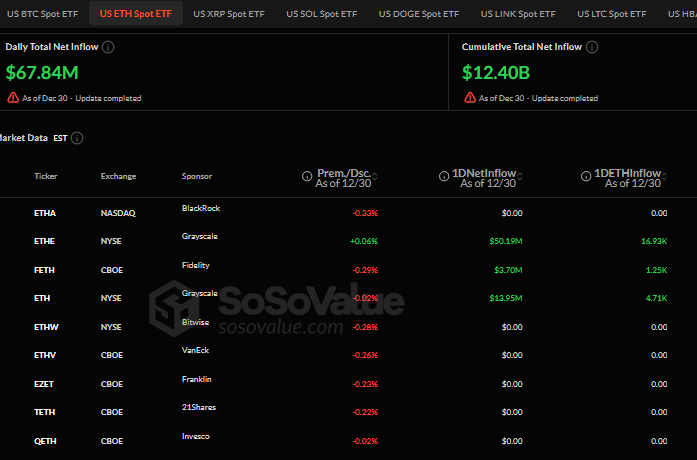 Ethereum spot ETFs showed steadier conditions by comparison as On December 30, ETH-linked ETFs recorded $67.84 million in net inflows, lifting cumulative inflows to $12.40 billion.