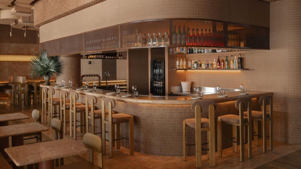 The Embassy by Devlin’s opened in February and when Grogan visited in May, she was ushered inside the century-old building and into a beautiful room with Art Deco wallpaper, exposed brick, cinder orange booths, floorboards and … a tree in the middle of the restaurant.