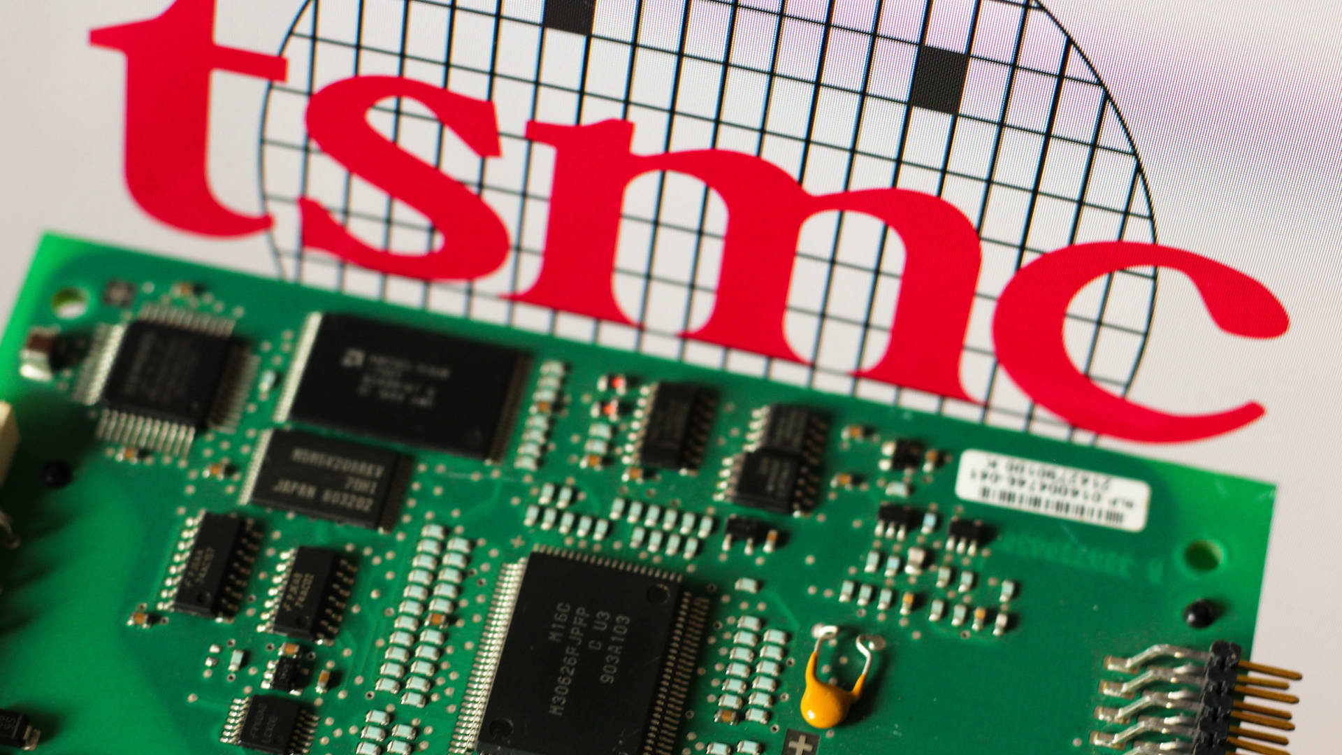 Taiwan Semiconductor Manufacturing Company’s logo is seen in the background beside a printed circuit board.