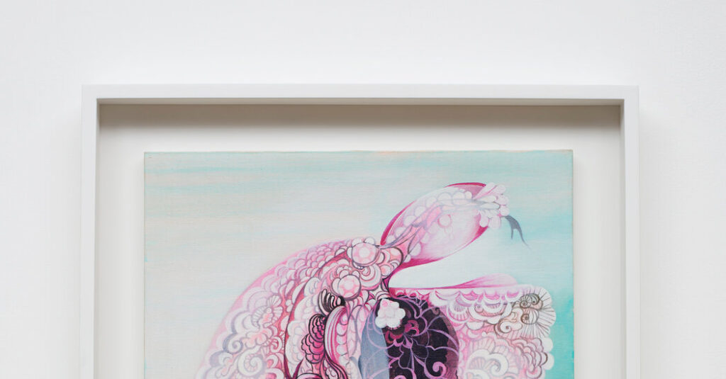 In her work “The Eye,” Seraphim painted women wearing insect wings and diaphanous dresses laced with capillaries, gliding through buildings resembling stone hoodoos. “Dance of Love” portrays sunken machines and buildings beneath a female form triumphantly springing from a flower amid pink swirls and a stylized snake. In “Flower Woman,” a sphinxlike woman’s head envelops petals and a seahorse, while butterfly wings cascade down her back and blossoms fill her breast. All three works are included in the Maastricht show.
