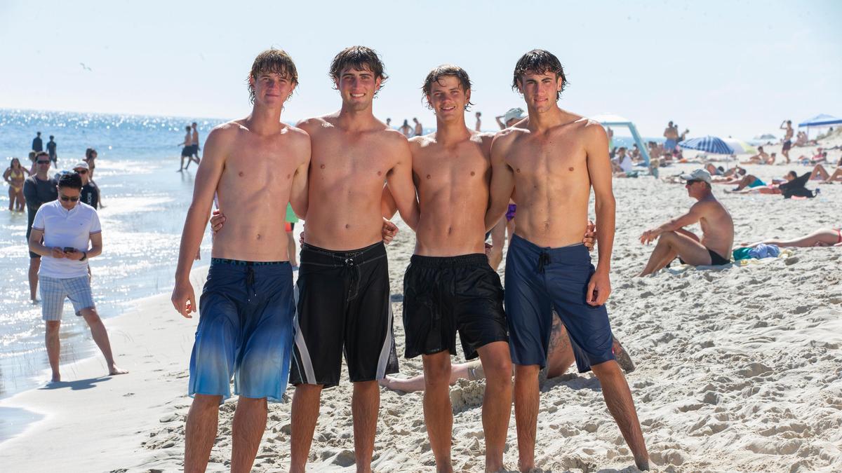 Among the many at Cottesloe Beach were close mates Bayden Murdock, Elliot Greenwood and Tom and Rhys Murray, pictured, who spent a day out at the packed out hotspot to make the most of the holiday break.
