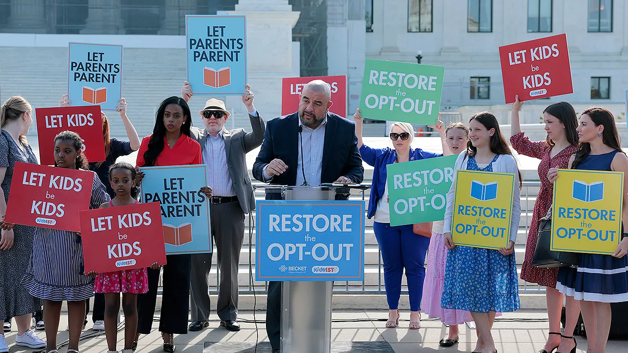 Members supporting the Opt Out policy in public schools attend a rally as oral arguments on Mahmoud v. Taylor, a religious freedom case involving LBGTQ+ curriculum. A diverse coalition of plaintiffs seek to defend their rights as religious parents to be notified and opt their children out of Montgomery County Maryland’s controversial LGBTQ curriculum at the Supreme Court in Washington, DC on April 22, 2025. (John McDonnell/For The Washington Post via Getty Images)