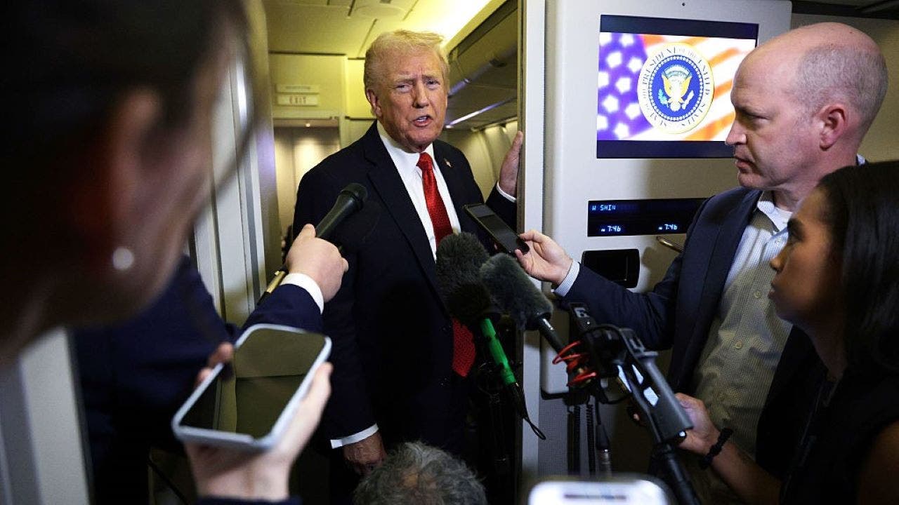U.S. President Donald Trump speaks to members of the press on October 19, 2025 aboard Air Force One. The President is returning to Washington, D.C., after spending his weekend at Mar-a-Lago resort in Palm Beach, Florida. (Photo by Alex Wong/Getty Images)