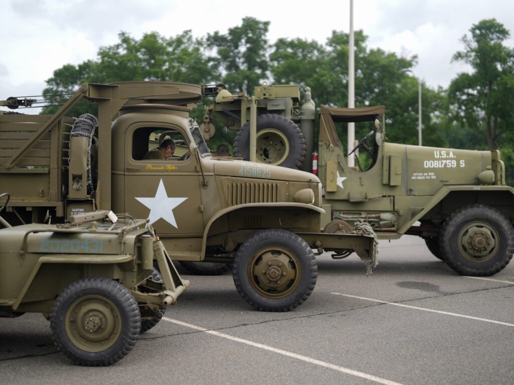 The military spectacle is divided into historical segments, with troops and equipment representing different eras of US Army history.