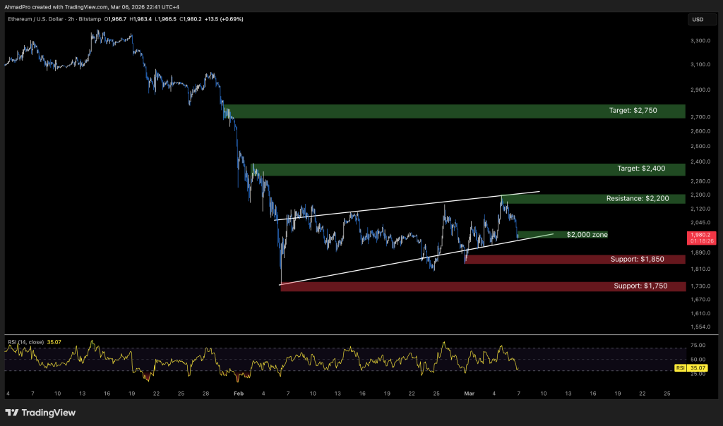 Price bounced hard from the late February lows, jumping from around $1,830 to nearly $2,200 before cooling off again. Since then, ETH has been hovering just above the $2,000 level, and that area is starting to draw a lot of attention.