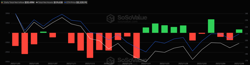 Moreover, the US ETH ETFs posted positive flows on 8 December, breaking a brief red streak with $35.49 million in outflows. The total net inflow now stands at $12.91 billion.