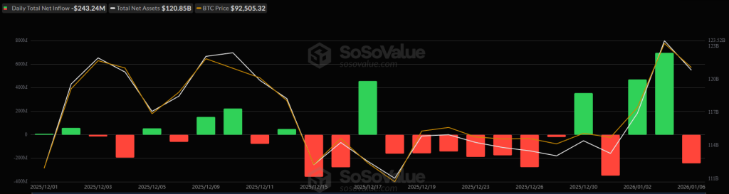 After a couple of days of increases, the US BTC spot exchange-traded funds (ETFs) recorded negative flows. On Tuesday, these let go of $243.24 million in total. With this, the total net inflow pulled back to $57.54 billion.