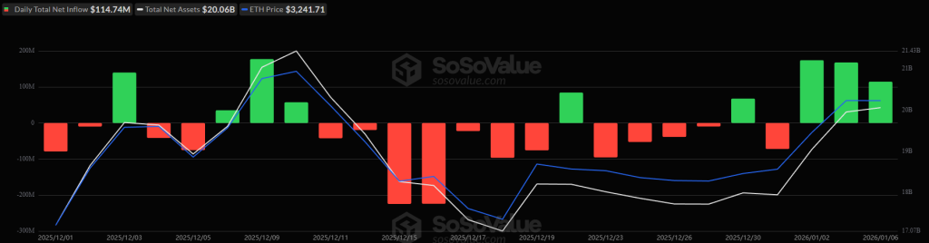However, the US ETH ETFs posted another day of positive flows on 6 January, for a third day in a row, with $114.74 million. The total net inflow increased slightly to $12.79 billion.